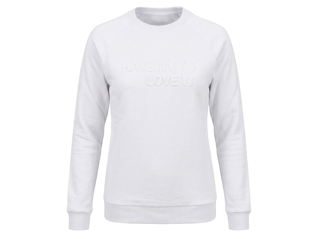 Minimalistická mikina bez kapuce (crewneck) v bílém provedení s výrazným, ale stále decentním detailem: reliéfním (3D) nápisem „HATE IT / LOVE IT“ na hrudi. Skvělá volba pro každodenní outfit – od města po volný čas.