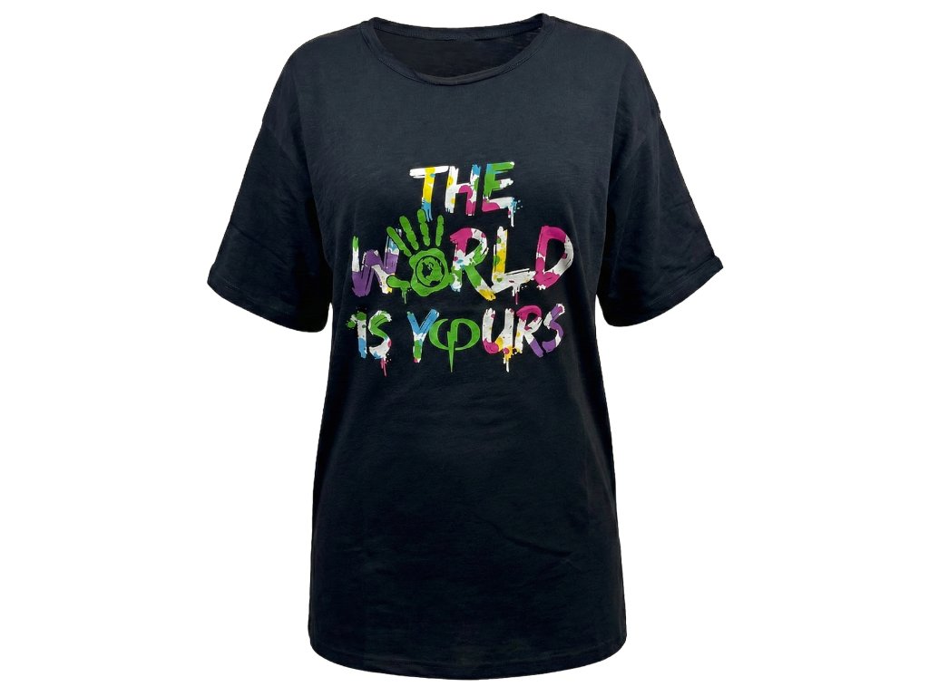 - Výrazný motiv „The World Is Yours“ – moderní streetwear vibe
