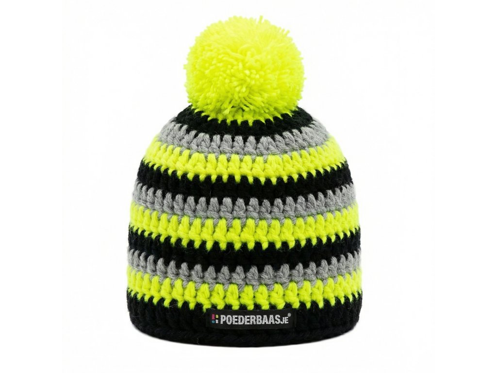 Hřejivá dětská čepice Poederbaas s výraznou bambulí a pruhovaným vzorem. Uvnitř je teplá černá podšívka, díky které čepice dobře zahřeje v chladnějším počasí.