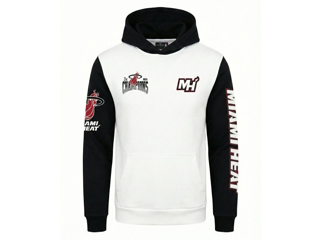 Stylová fanouškovská mikina s kapucí od Hollister pro NBA Miami Heat. Kontrastní provedení (světlé tělo + černé rukávy a kapuce) doplňují výrazné týmové potisky – ideální do města, na zápas i na volný čas.